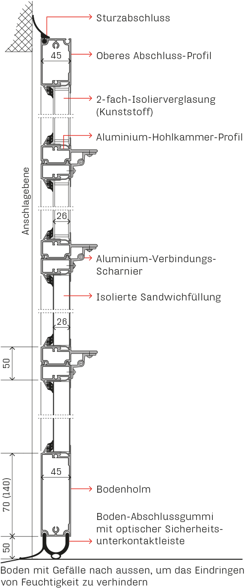 Feldereinteilung durch horizontal gegliederte Sektionen und vertikale Sprossen. Sektions­höhen je nach Torhöhe und Anzahl Sektionen zwischen 500 und 700 mm, Felderbreiten je nach Torbreite und Anzahl Felder zwischen 1 000 und 1 400 mm.